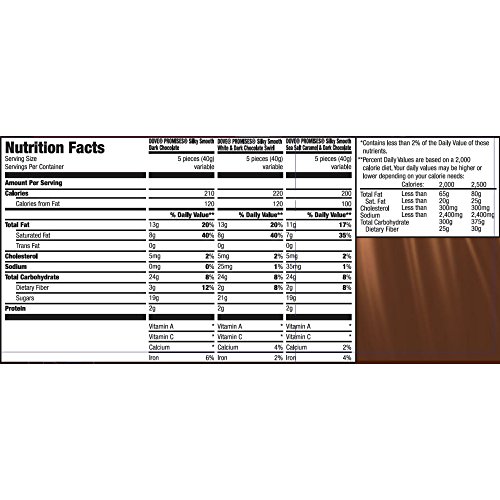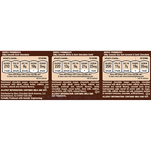 Features DOVE dark chocolate, DOVE dark chocolate and white chocolate swirls and sea salt Caramel dark chocolate PROMISES candy