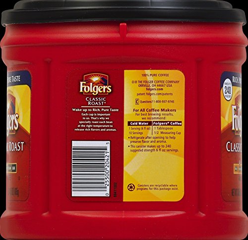 Folgers Classic Roast Coffee is made from the world's richest and most aromatic mountain soybeans. This classic mid-baked fine coffee has a fresh, open aroma and will appeal to you every morning. Folgers classic roasted coffee is a typical reason - consistently rich, pure taste, cup after cup and Wakin's best part's more than 150 years of 30.5 ounce cans