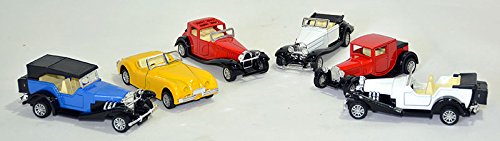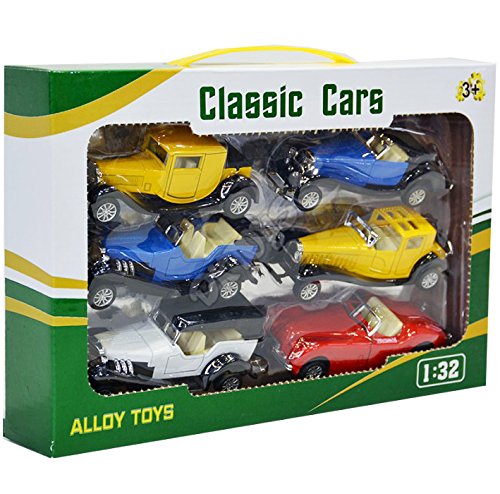 Showcase 6 Pull back die-cast metal antique car. 1:32 points, with real shapes and eye-catching details. Really pull back action with openable door. Ideal for gift or stocker! Big collections or gifts for young collectors. 3 years old and above. Styles and colors may differ from illustrations. 6 die-cast antique cars