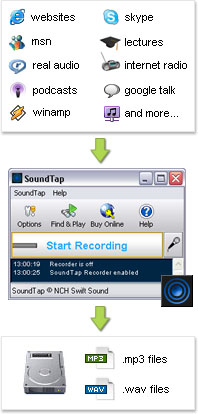 SoundTap is a stream audio capture software that can convert any audio played through a computer into an mp3 or wav file. Streaming audio is recorded by a special kernel driver to maintain digital audio quality.