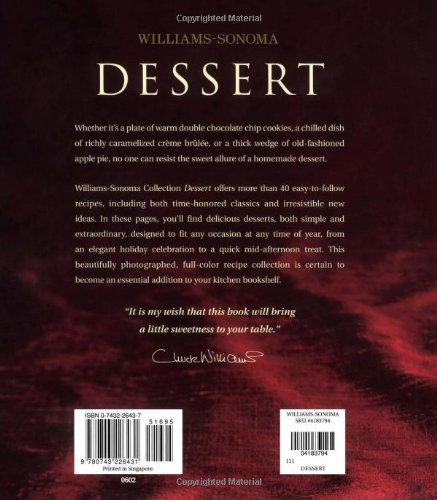 Williams Sonoma Collection dessert offers over 40 easy-to-follow recipes including vintage Classic and irresistible new ideas. In these pages, you can find delicious desserts that are simple and extraordinary, suitable for any occasion, from an elegant festive celebration to a quick afternoon meal. This beautiful photo collection of full-color recipes will definitely be an important addition to your kitchen shelf.